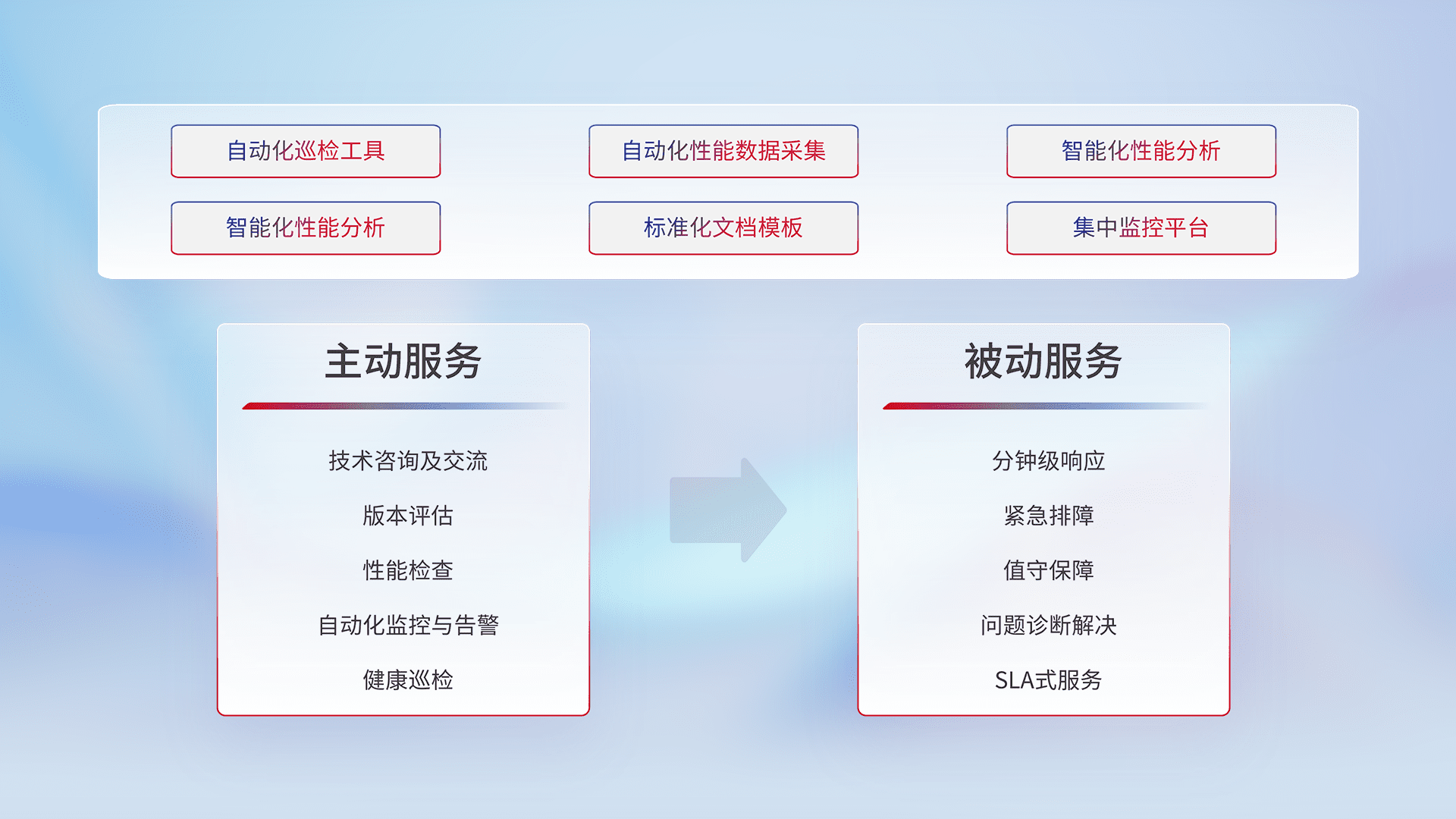智能化工具和标准化文档,,保障服务质量,,,,提供主动服务(包含技术咨询、、、、版本评估、、性能检查、、自动化监控与告警、、健康巡检)和被动服务包含(分钟级响应、、、、紧急排障、、值守保障、、问题诊断解决、、SLA服务)。。
